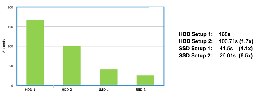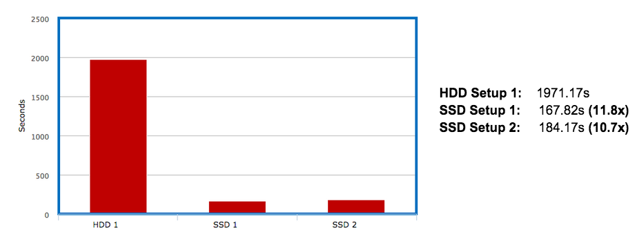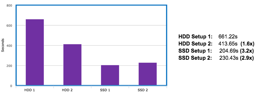 First, we ran a simple join query between a table with 1 billion rows and a table with 50 million rows. The total amount of data processed was around 46GB. The results fell in favour of SSD’s.